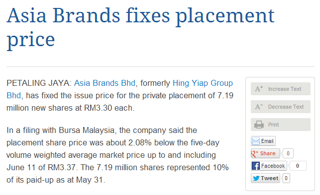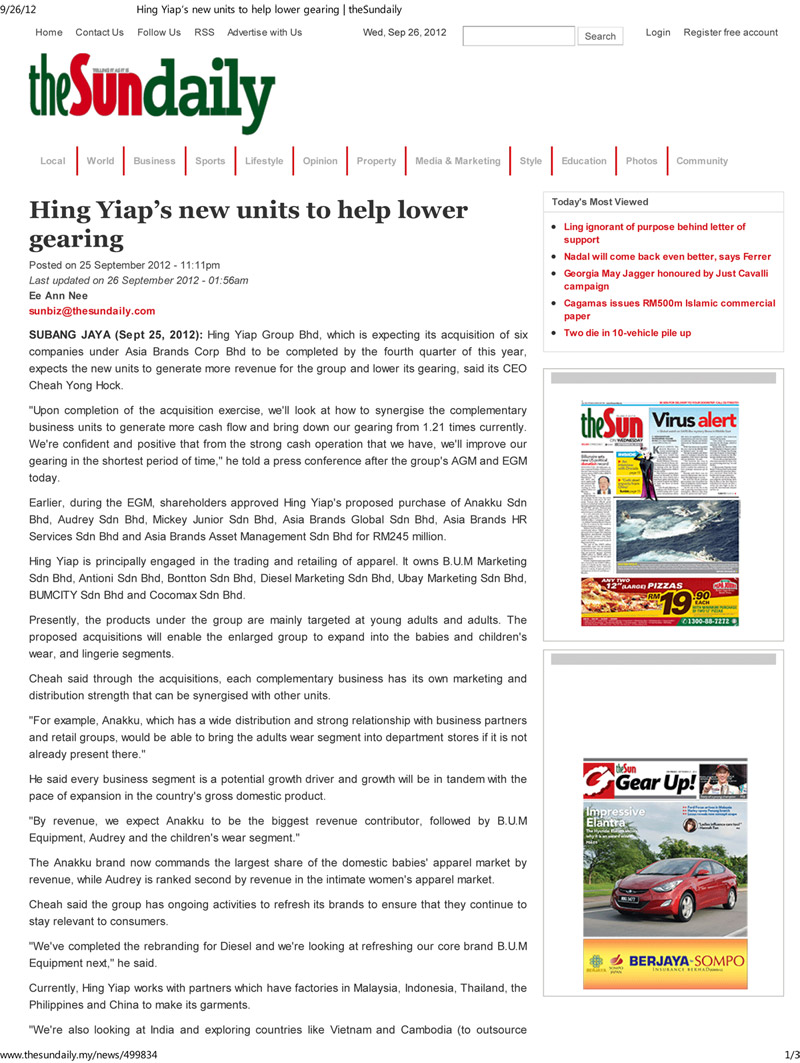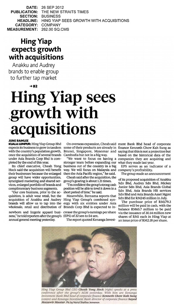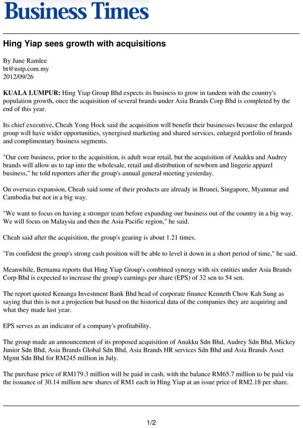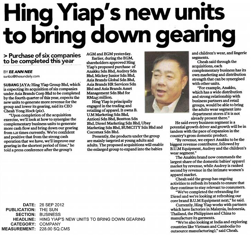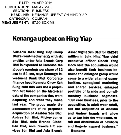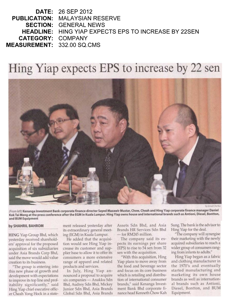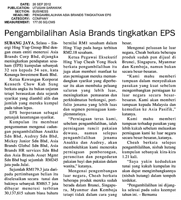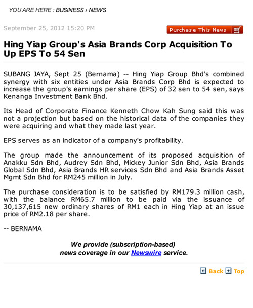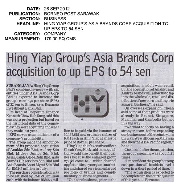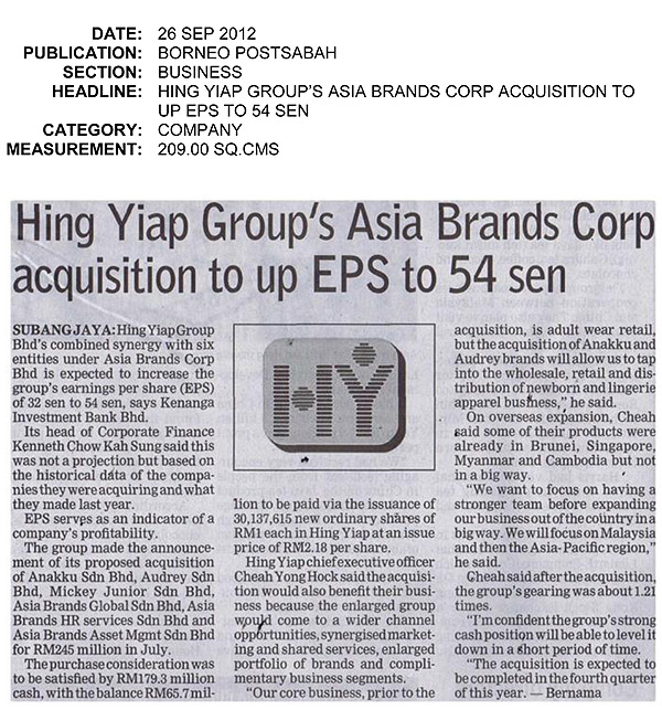 Hing Yiap Group's Asia Brands Corp Acquisition To Up Eps To 54 Sen