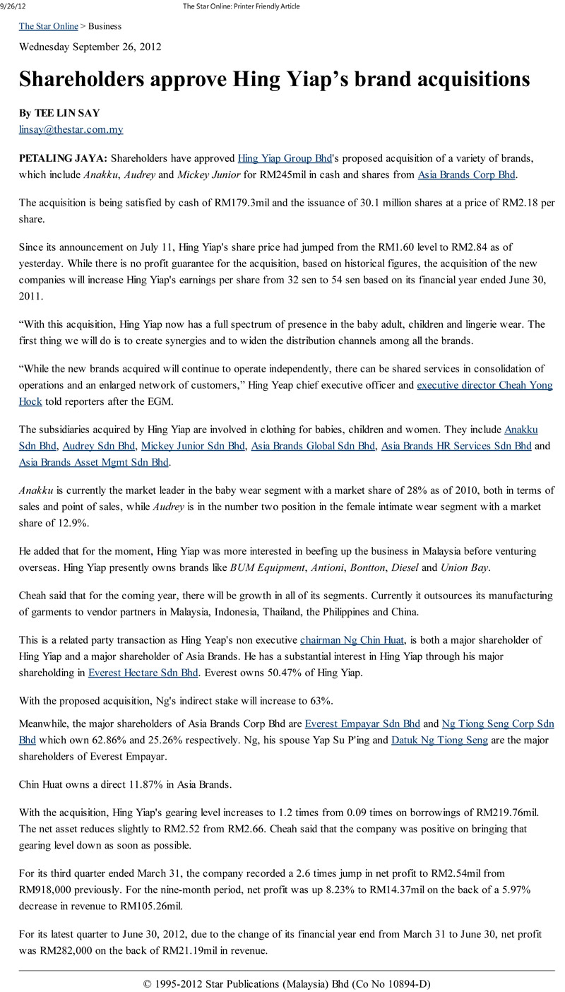Shareholders Approve Hing Yiap-Brand Acquisitions