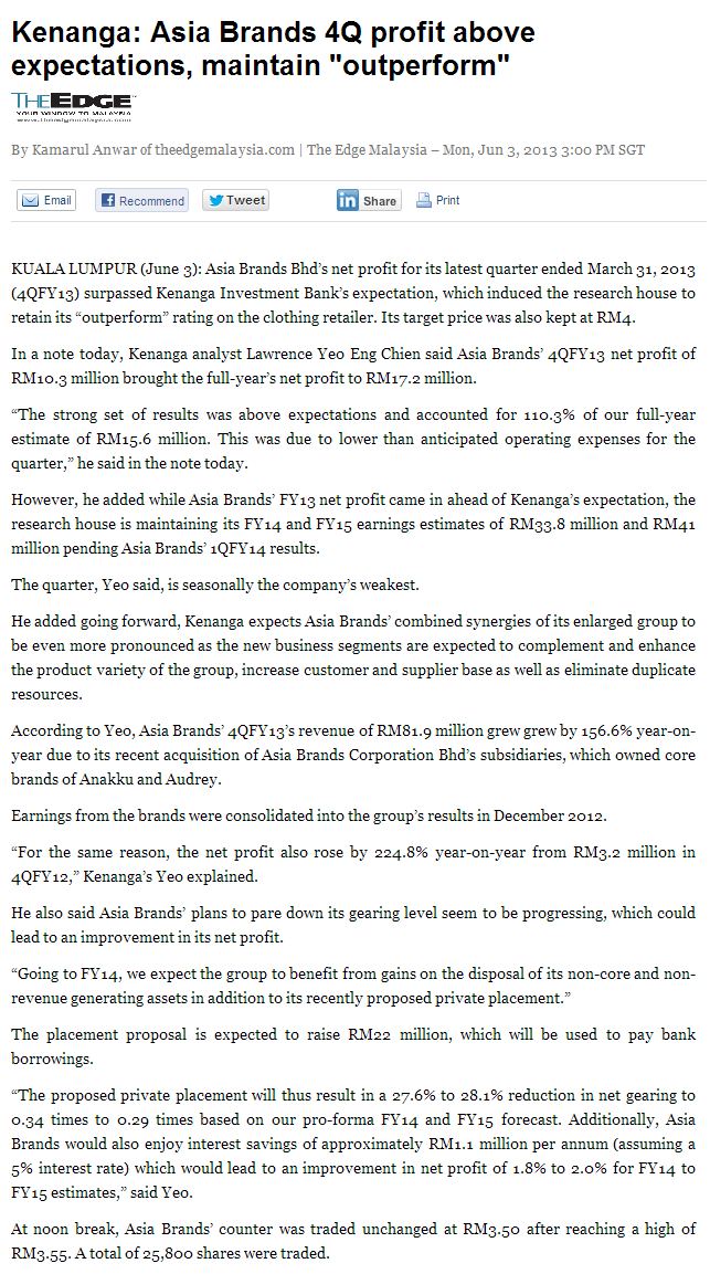 Kenanga: Asia Brands 4Q profit above expectations, maintain "outperform"